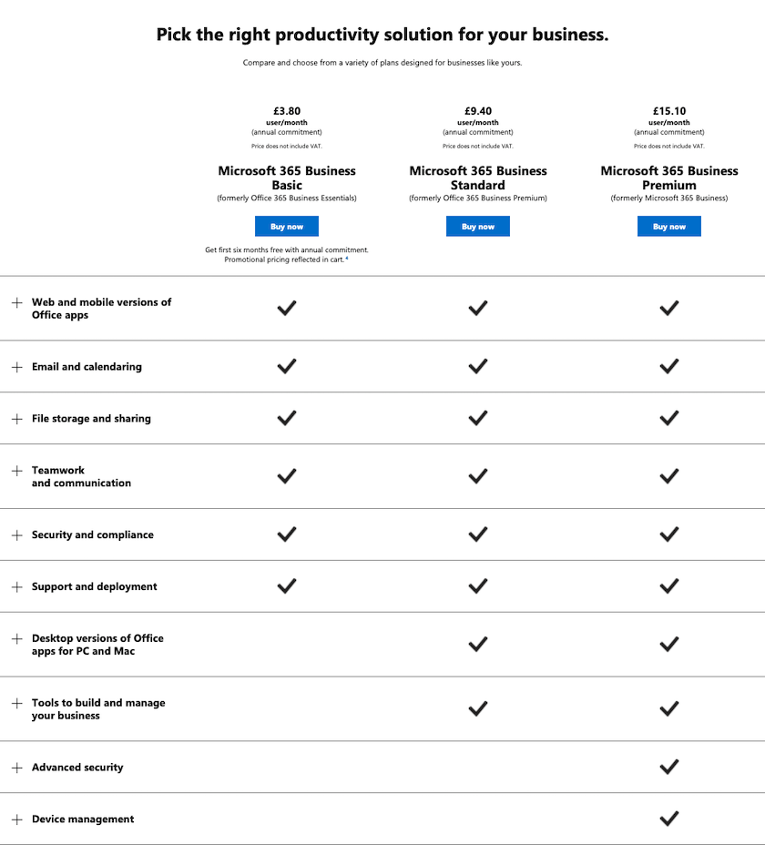 Similarly, 365 offers 3 business plans: Business Basic, Business Standard, and Business Premium. Each option offers 1TB of storage, web and mobile apps, emails and calendars, access to Teams, and comprehensive security and compliance features. What differs the Business Standard package from the Business Basic is the ability to install the desktop applications onto PC and Mac, as well as integrated planning tools. Premium goes one step further, with even more advanced security features and device management.